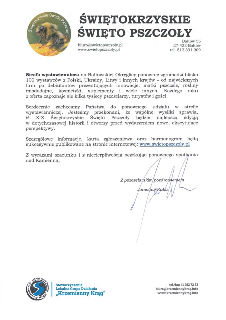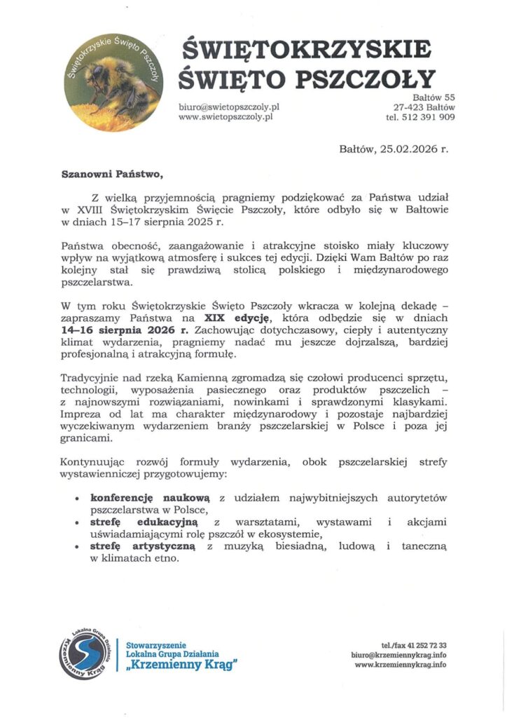 Serdecznie zachęcamy Państwa do ponownego udziału w strefie wystawienniczej. Jesteśmy przekonani, że wspólne wysiłki sprawią, iż XIX Świętokrzyskie Święto Pszczoły będzie najlepszą edycją w dotychczasowej historii i otworzy przed wydarzeniem nowe, ekscytujące perspektywy.